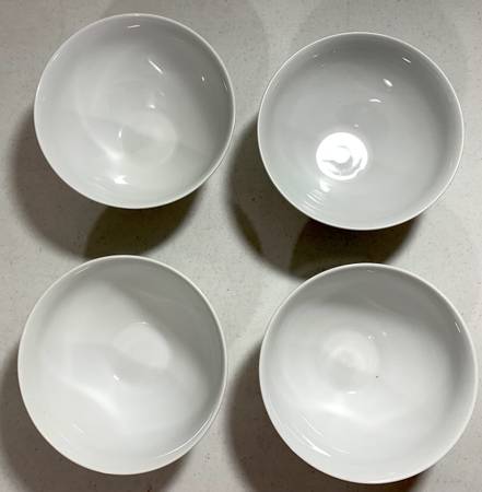 - 4 (Four) Soup / Cereal bowls 5.5" across x 3"H - white with 2 orange flowers spaced evenly around 3 times