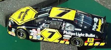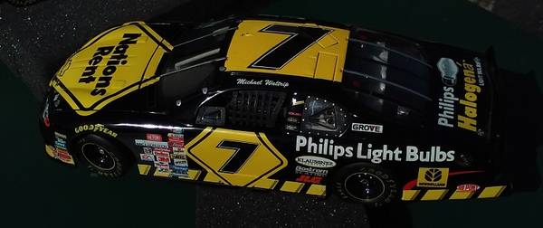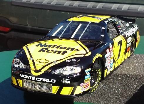 It's a die cast replica of the 2000 Monte Carlo, driven by Michael Waltrip #7. It features a black body color with the Nations Rent branding. The Chassis is highly detailed, with rear axle shocks. There's no box but the car itself is in great condition. Perfect for NASCAR or diecast car collectors.