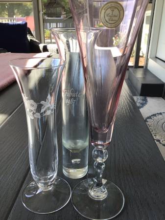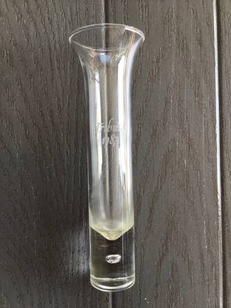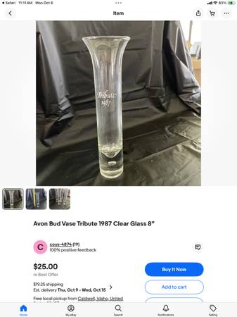3). Avon Bud Vase 8” Clear Glass “Tribute 1987” etching