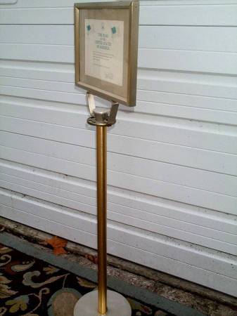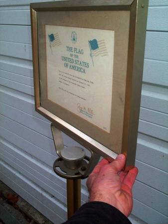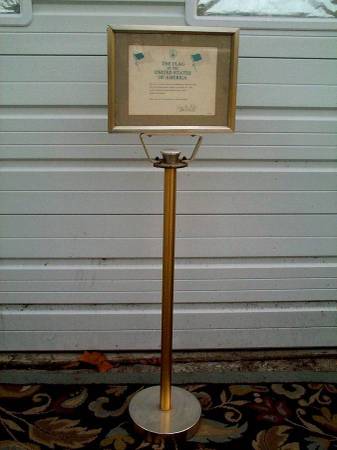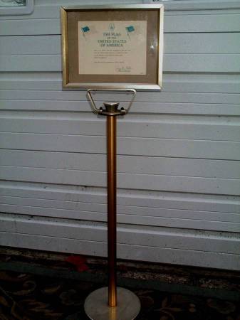 PRICE GETS BOTH THE HEAVY GLARO STANDING SIGN and AWARD. If you collect one of a kind Americana memorabilia this may be for you. United States Capitol building award collectible from May 12, 1984. HEAVY industrial Glaro brand self standing pole advertising framed sign. Rich looking gold metal. These are the kind of self standing signs you see in prestigious locations. Marty Russo member of congress presenting Pierce Ennesy of a documentation that his flag flew over the Capital building. Signed by George M White. Flag is not included. Measures aprox 15" wide x 10" deep x 53" height. You can also put another display in the self standing Glaro frame sign for your business as well and just save the flag document collectible. Pick up from North Aurora, Illinois. Ground level ready to go. Please CALL or TEXT show contact info