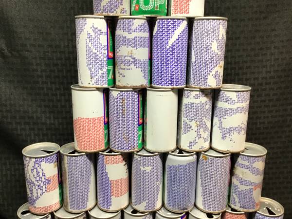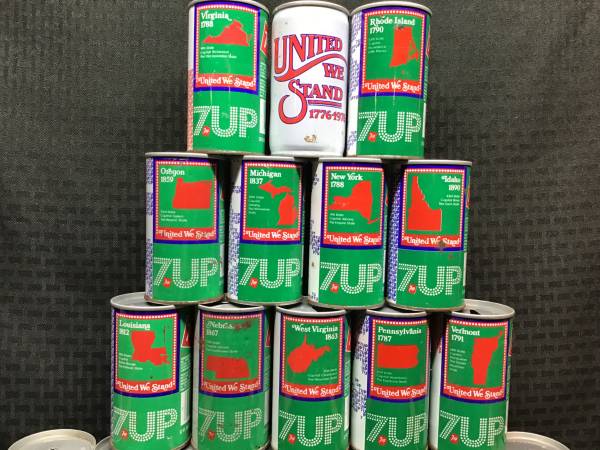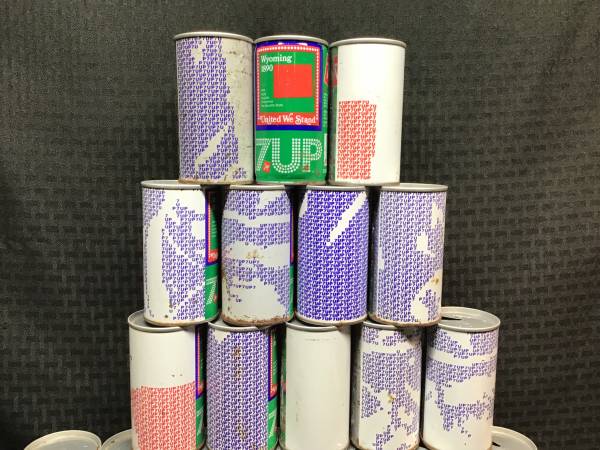 Lot of 27 empty state 7-up bicentennial 1976 tin soda cans.
