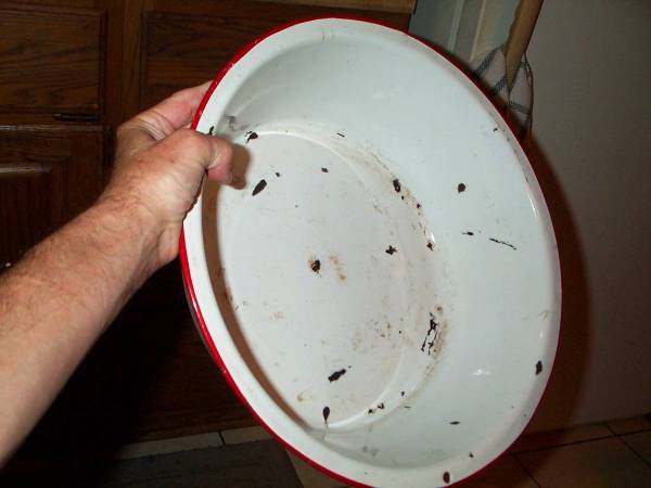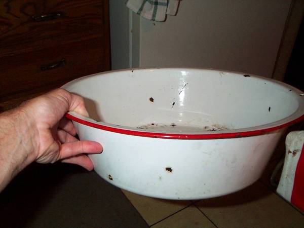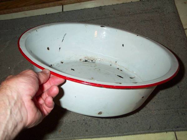 Antique round wash bowl pan. Farm house basin style. Heavy metal.White with red trim. Circa 1930's 1940's vintage. Some paint loss. Great for display or actual use. Also perfect display item for any fine vintage motif. Measures aprox 15" round x 5" height. Pick up from Villa Park. Please call or text show contact info