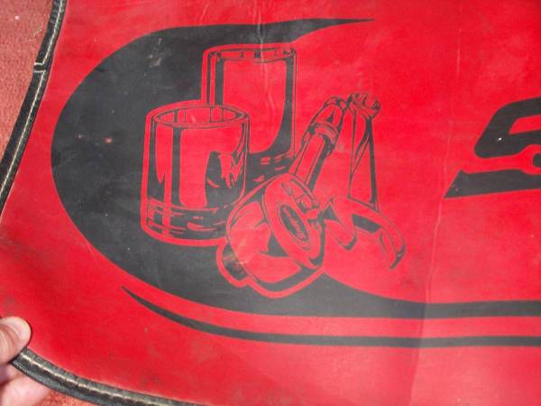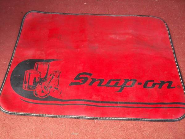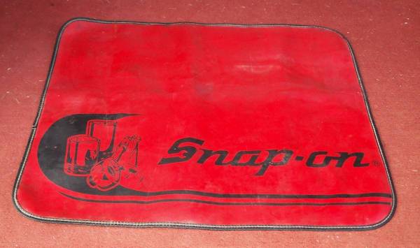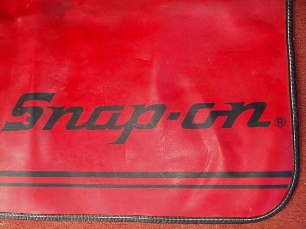Rare design vintage Snap-On Tools mechanics fender cover accessory thick mat. Strong black stiched sides with rubber backing. This mat is also great for the top of your work bench taking delicate items apart. Large size measuring aprox 32 3/4" length x 26" deep. Pick up from Villa Park. Please call or text show contact info