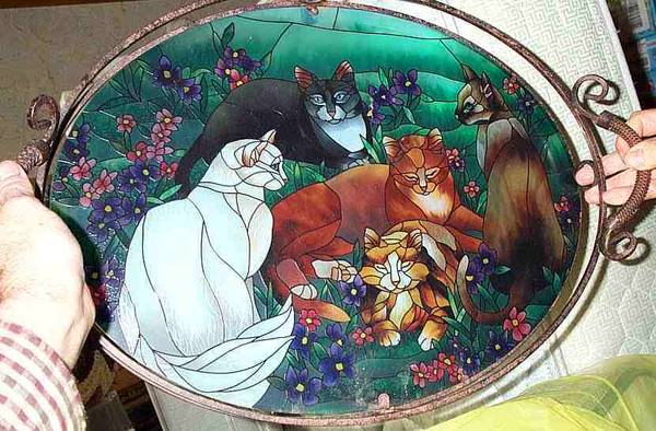 Rare large and beautiful vintage stained glass style mosaic floral cat themed serving tray. Heavy wrought iron type frame with raised edges to keep all on the tray secure. Carry handles on each side. Glass looks amazing when held up to a light. Tray will display elegantly on a dining room table. Measues aprox 21 1/4" length x 14 1/2" deep x 3 1/2" height. I would sell this serving tray on eBay however it would be a fragile item to ship...local pick up is easier. Pick up from Villa Park, Illinois. Please call or text show contact info