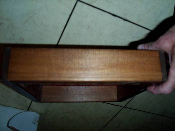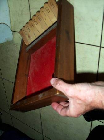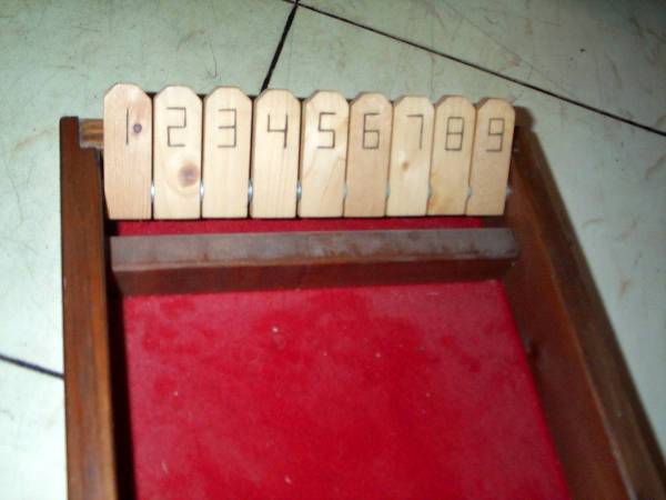Vintage "Shut The Box" red board game with lift up numbers. Raised edges. Roll dice (not included) on the red felt. May have been custom manufactured. Measures aprox 10" length x 12" deep x 2 1/4" height. Pick up fromVilla Park. Please call or text show contact info