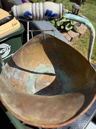 Copper brass coal scuttle bucket. Lionheads. Porcelain blue white handle One handle missing