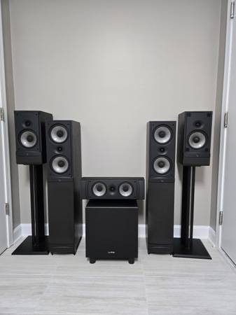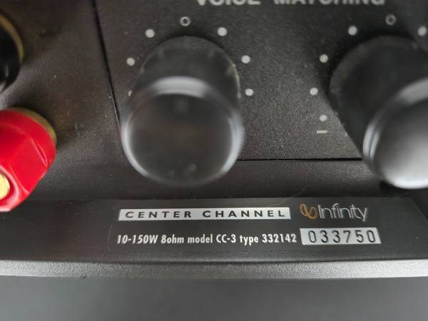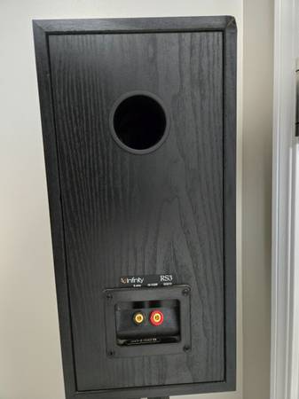 Infinity Subwoofer, Center, Front and Rear Surround Speakers with 29" stands; 8 Ohms, 15W-200W System. Very slight physical damage (surround speaker grills) but in perfectly good working condition. All speakers are in mint condition. I also have a 150W Yamaha receiver I will sell with it or separately however I have not removed it from its cabinet yet.