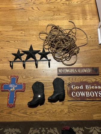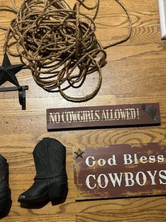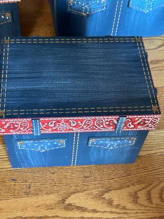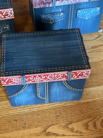 WESTERN THEMED KIDS BEDROOM 3 WESTERN WICKER BASKETS 5 HARD WOOD BLUE JEAN WITH LIDS THEMED BOXES 2 MINI COWBOY BOOTS WESTERN STAR 3 HOOK HOLDER NEW BOOT PICTURES DISPAY 3 VARIOUS SIGNS 1 COWBOY ROPE