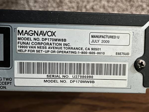 DVD / CD Player - Magnavox. Model DP170MW8B Works, but no remote and missing DVD door. Cash and pick up only. New Lenox, IL near Laraway and Schoolhouse.