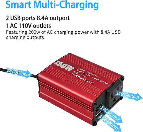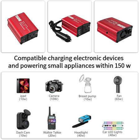 * PORTABLE & WIDELY USEFUL: The lightweight inverter supports all 12V models car, easy to take anywhere on , such as your car travel, camping and so on. Charge for your power hungry tablet, cpap machine,breast pump, GoPro camera, TV, car vacuum cleaner, LED table lamp and your mini fridge while on the go. (Not suitable to rice cooker, microwave oven, hair dryer which over 180W output.)