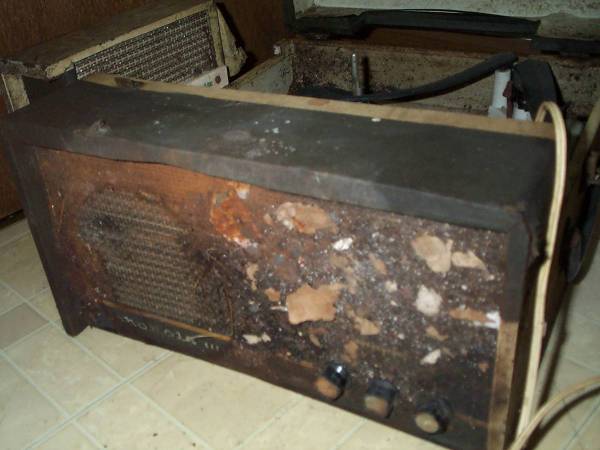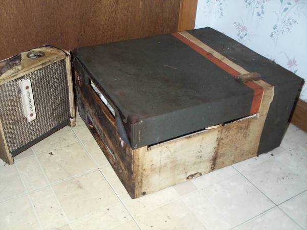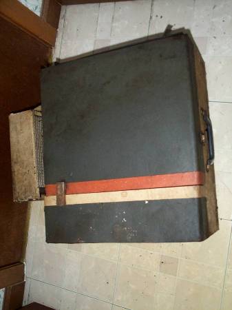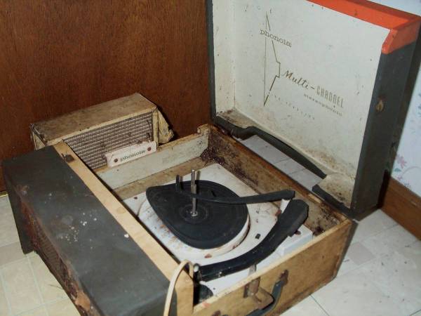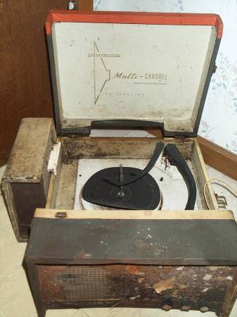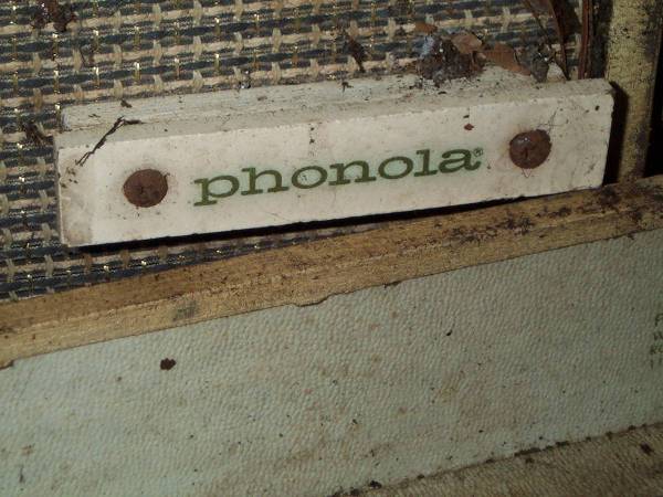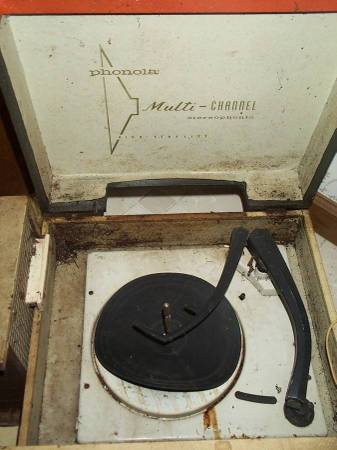 Circa late 1950's early 1960's PHONOLA suitcase model multi-chennel stereo suitcase model record player. Features a 4 speed record changer. I think the tube amplifier has two 50EH5 tubes. Perhaps more rare than the "Phonola" phonograph itself is the included original right channel extension speaker. Most of the extension speakers were long lost. The left channel speaker is built in to the phonograph. The cabinet suffers from being stored in a damp location. I did plug the phonograph in to electric for testing and suprisingly the turntable turned smoothly and the idler wheel appeared to be still good. The amplifier tubes lit up and I got noise through the extension speaker. Most of the restoration on this unit would be to restore the cabinet. The needle and cartridge in the tone arm are still in place. Phonograph measures aprox 15 1/2" length x 17 3/4" deep x 8 1/2" height. Pick up from Villa Park, IL. Please call or text show contact info