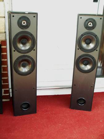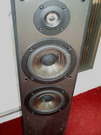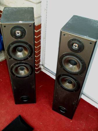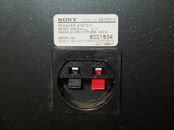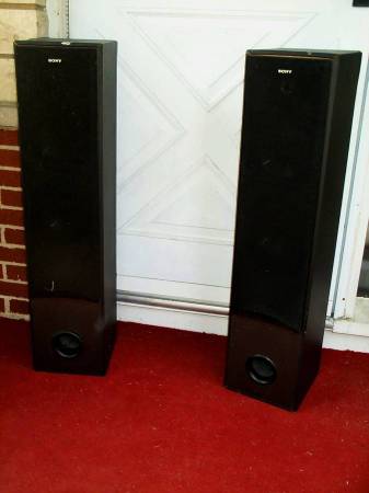 Pair of high quality vintage heavy self standing Sony column stereo speakers. Model SS-MF415. Maximum power 200 watts at 8 ohms. Each cabinet has two 7 1/2" woofers and one 4" tweeter. Port holes at bottom for lots of bass. Removeable front grill covers. Cabinets measures aprox 8 3/4" length x 9 1/2" deep x 37 1/2" height. Some moisture separation on cabinet corners but still looks nice. Pick up from Villa Park, IL. Please call or text show contact info