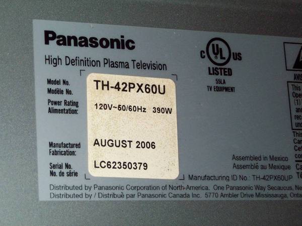 Non working Panasonic 42" flat screen plasma TV. For parts or repair. Powers on though has a cracked screen and does not light up. Lots of good boards inside. Manufactured August 2006. TV measures 38" wide x 9" thick x 24" height. Easy pick up from Villa Park, IL a few blocks north of Roosevelt Road. Please call or text show contact info