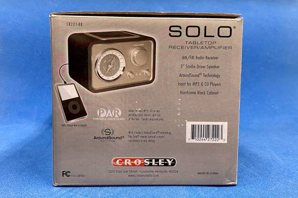 Crosley Radio / Receiver, in like-new condition. Don't let the tabletop size fool you! Powerful single speaker in a small stylish package. Retro analog-tuning main dial has a warm 1930's glow. Handsome Black Woodgrain Finish. Plug in your portable music player for rich, full sound. Orange LED indicates AM/FM/AUX status. One male-to-male 3mm Audio Cable, Power Cord, Owner's manual, Original box and complete packaging included.