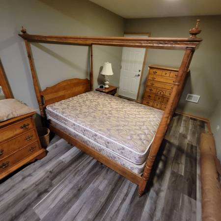 Cash sale. Reduced from $4500. Offers considered. (7 pcs total) c.1955-1962 Solid Maple in excellent condition. Some beautiful Tiger-striping where quarter-sawn (posts, drawer fronts). Reduced from $4500. pu in Addison, IL by appointment; I can give you contact for cost-effective movers we have used // Full size 4-Poster Bed and Sealy Premium Plush Firm Mattress (like new) and Box spring. 59Wx 83Lx73H +9-7/8"post extensions, opt// Night Stand 25Wx16Dx25H// 6-Drawer tall dresser 38Wx20.25Dx51.75H// Dresser & Mirror 57Wx20.25Dx33H with mirror mounted 78.5H // Bookcase 24"W x 10-3/8"D x 29"H available - separately priced. Lamp available - separately priced.