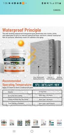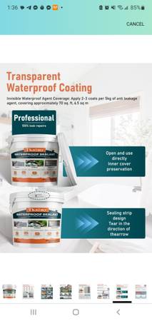 This brand new 175oz transparent waterproof coating is a water-based, invisible sealant perfect for roofs, bathrooms, kitchens, shower walls, and outdoor areas.