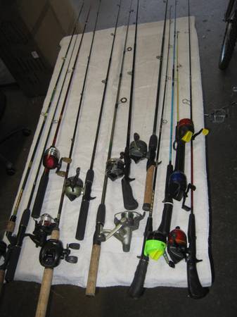 Rods and reels lot for sale. Shakespear, Johnson, Zebco, Berkley, Quantam, Garcia. All are in good condition. Check out pics. $ 60. If interested call........ ......630 - four 33 - six 2 four 7.