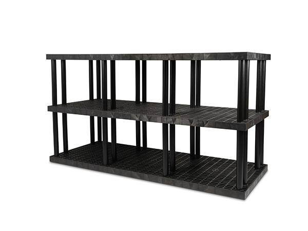 8ft wide x 16 inches deep x 27inches high - 2 shelves, black, shelves are solid no holes. 8 - 24" posts and 8 leg connectors. $120 (two available)