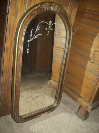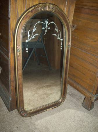 THIS IS AN ANTIQUE MIRROR WITH SILVER ETCHINGS IN THE GLASS. THE DECORATIVE WOOD FRAMED MIRROR MEASURES: 26 1/2" TALL X 14 1/4" WIDE X 1" THICK. IT IS IN GOOD CONDITION WITH SOME WEAR OVER THE...