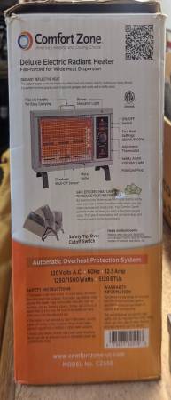 2-Electric Space Heaters 1) Ceramic Space Heater 750/1500 Watt, tip over safety shut-off, overheat safety shut-off, thermostat control. $35 2) Comfort Zone Space Heater 1250/1500 Watt Portable...