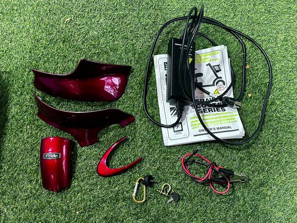 Includes charger, two key sets, extra red fenders, oxygen tank holder, two manuals