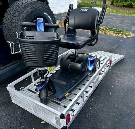 Also included is a sturdy aluminum trailer with ramp (requires a 2‑inch hitch receiver) that attaches to the scooter for transporting cargo or gear. I’m selling because this because my grandfather is no longer able to use it.