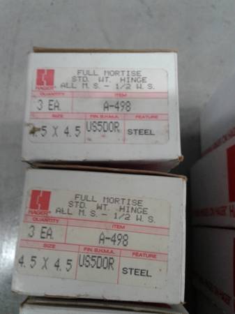 10 boxes Hager door hinges 4.5 x 4.5 full mortise new in box with plastic film protectors. 6 boxes of gold 3 per box. 4 boxes of antique bronze 3 per box. These are nice made in USA old stock with brass screws see pic for condition $75 OBO. Cash only no trades.
