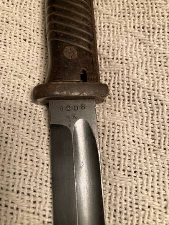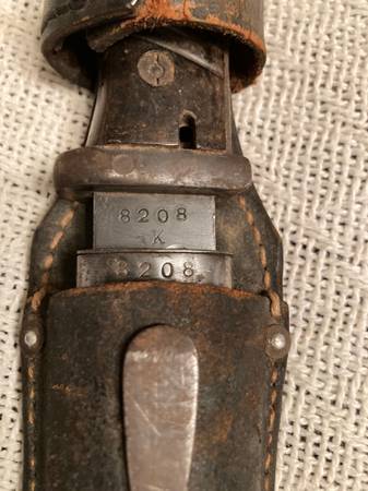 K98 German NUMBERS MATCH Number on the scabbard and the main artifact match. Number is 8208. Engraved date 1941 -- 41 cof. Including the scabbard and the frog. Cash only. I am near Willow Springs...