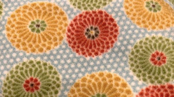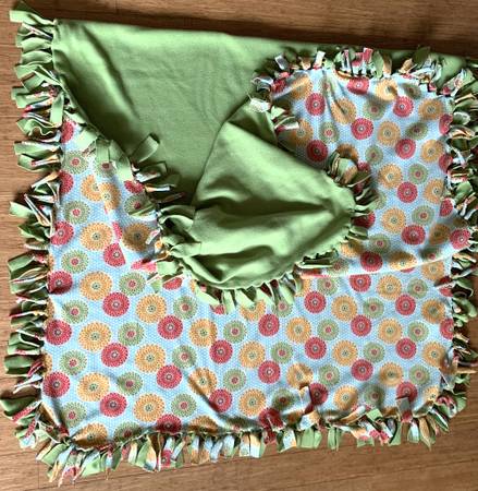 - Light blue & white background with multi-colored circular pattern on one side - plain green fleece on the other