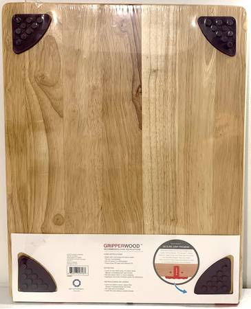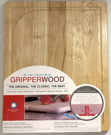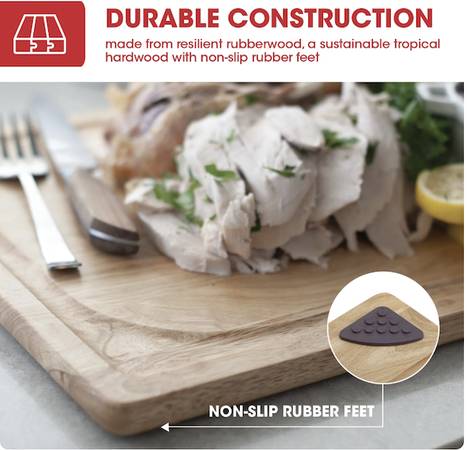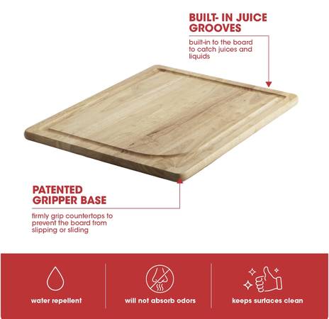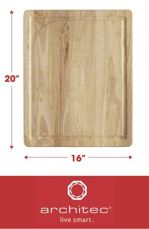 - Solid wood board has smooth side for cutting - Grooved near edges to catch juices
