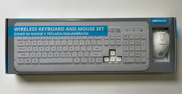 Two new in original sealed box Medion® wireless keyboard and mouse sets. Wireless up to 33 feet (10 meters). Sleek low-profile keys. Plug and play. Batteries included.