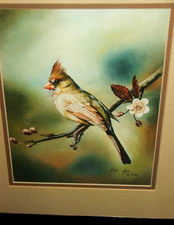 This is a masterful work of art by the world renowned artist Qua Lemonds. This colorful and vibrant print of a female Northern Cardinal is a signed limited edition, # 76 of 250 .