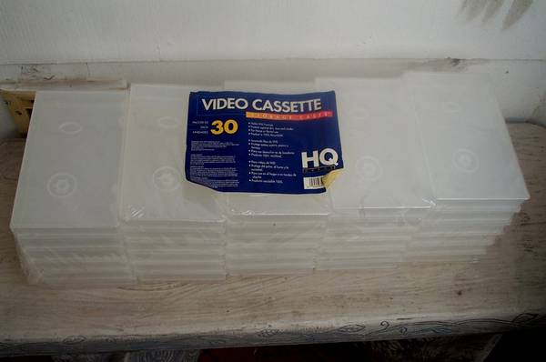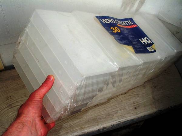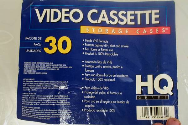 PRICE GETS ALL 30 VHS clear plastic clam shell holders to protect your VHS tapes.THESE ARE NEW OLD STOCK. 30 count package is sealed and in perfect condition. I showed an example of a single case from an opened package. Tapes not included. Protective cases only. Will not separate. Each case measures aprox 4 3/4" wide x 1" thick x 8" height. Easy pick up from North Aurora, IL. Please call or text show contact info