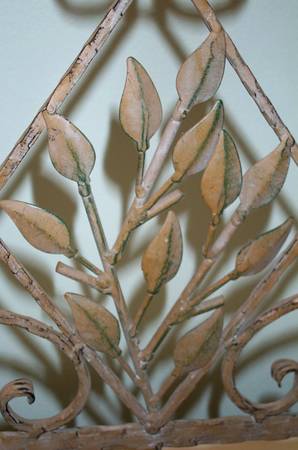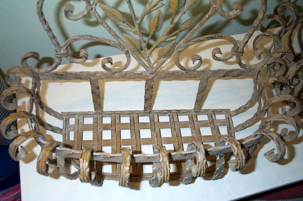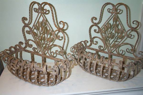 PRICE GETS BOTH matching antique metal heavy plant baskets. Beautiful Gothic Art Deco scrolling and leaf backdrop design. These self stand or can be wall hanging. Stunning and rare. Each measures aprox 17" length x 7" deep x 15" height. Pick up from North Aurora, Illinois. Please call or text show contact info