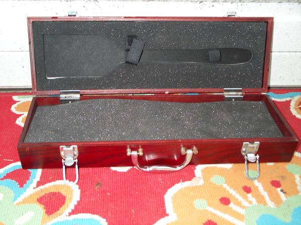 Fancy strong red wood grain case manufactured by Jackson. Two metal latches. Nice carry handle. Originally for expensive BBQ tools. Also good for a small musical instruments, other tools or anything else you want to keep safe while transporting. Foam rubber inside for protection. Lift up top foam to reveal more space on the bottom. Case measures aprox 21 6/16" length x 6 3/4" deep x 3 10/16" height. Pick up from North Aurora. Please call or text show contact info