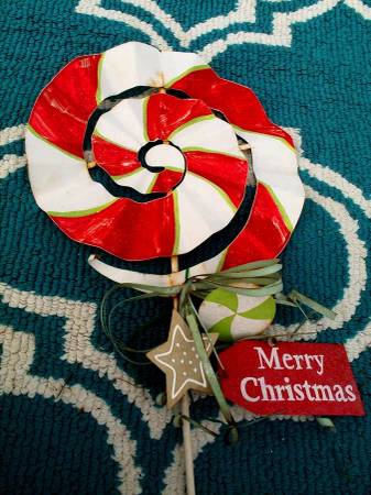 Scarce vintage "MERRY CHRISTMAS" colorful swirl peppermint candy cane vintage lawn spike. Strong metal. Nice used condition. Measures aprox 10" wide x 39" height. Pick up from North Aurora, IL. Please call or text show contact info