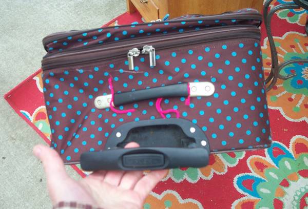 $3 for this unique color suitcase travel bag. Burgundy color with blue poka-dots. Pull up handle. Wheels on the bottom for rolling. The internal casing frame has some cracking. The outer material is still pretty nice. Handles are in good condition. Suitcase measures aprox 19" length x 12" deep x 27" height. Pick up from North Aurora. Please call or text show contact info