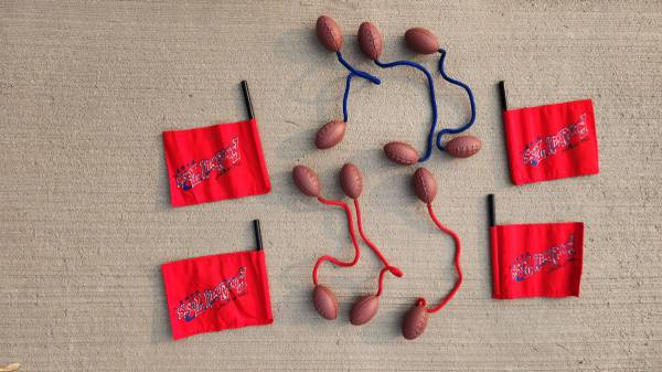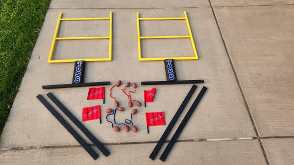 LADDER BALL FOOTBALL GAME 2 STEEL CONSTRUCTION GOAL POSTS 3 RED / 3 BLUE FOOTBALL BOLAS 4 FLAGS ORIGINALLY BOUGHT FROM MENARDS CASH ONLY