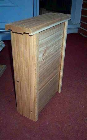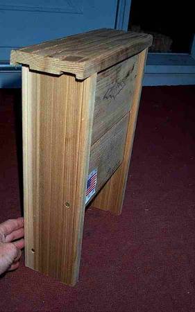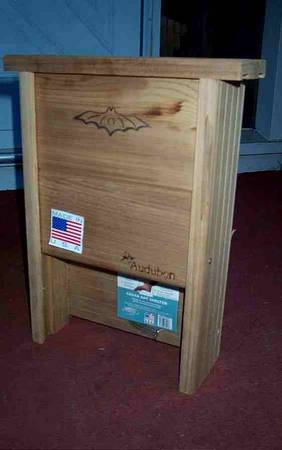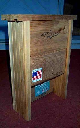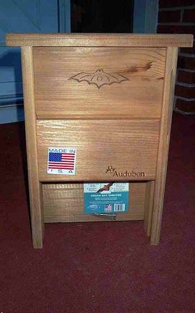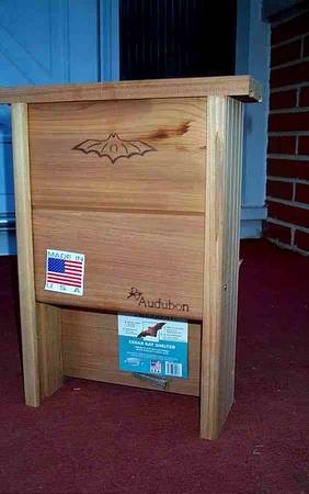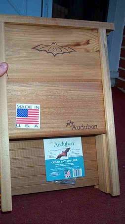 New cedar wall mount style bat shelter home. Complete with mounting screws. Made by Audubon. Beautiful handcrafted wood. Measures aprox 10 1/4" length x 4 1/4" deep x 16" height. Pick up from Villa Park, Illinois. Please call or text show contact info