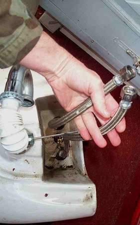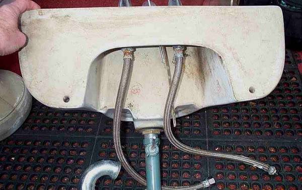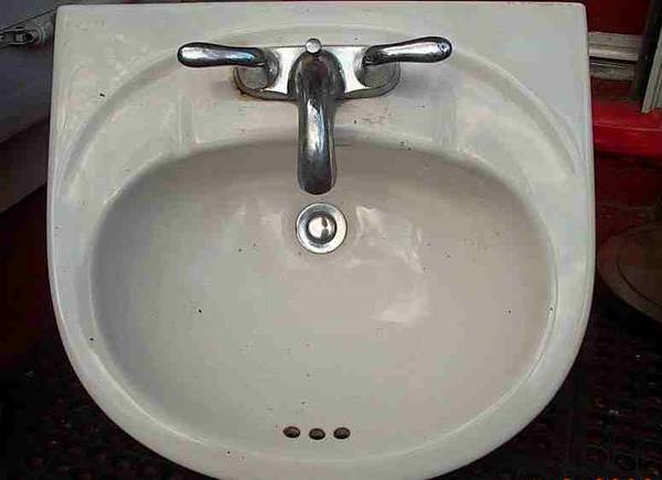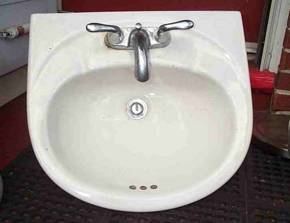 Ready to connect and use. Heavy porcelain bathroom rounded front sink complete with silver color water faucet, drain and hot and cold water connector hoses. Base or vanity not included. Please observe dimensions to see if this will fit your needs. Measures aprox 20" length x 18" deep x 9" tall and 16" tall with drain connections. Pick up from Villa Park, Illinois. Please call or text show contact info
