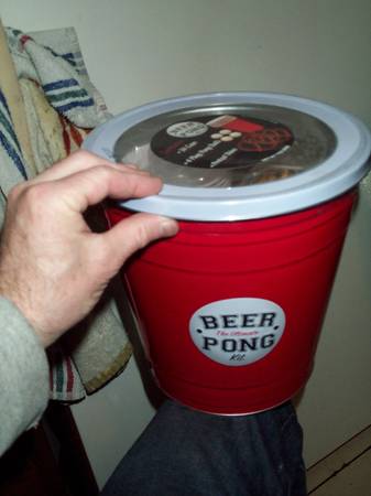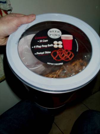 Beer Pong game. The ultimate kit. Sealed and new big can contains 14 cups, 4 ping pong balls and pretzel thins. New wt 7 oz. Best by 2019...so the pretzels might not be great...but everything else is fine. Measures 9" round x 9" height. Drink responsibly. Pick up from Villa Park, Illinois a few blocks north of Roosevelt Road. Please call or text show contact info