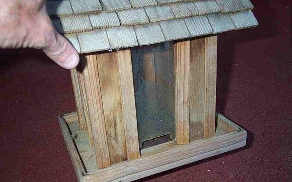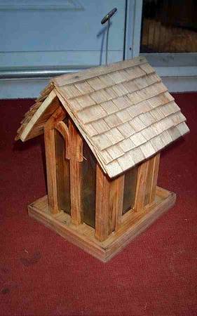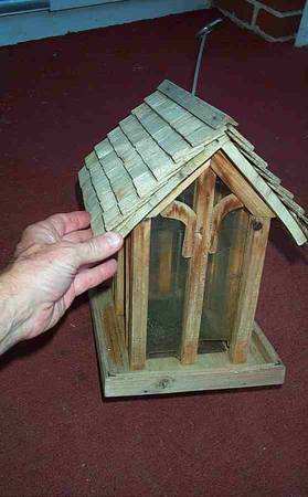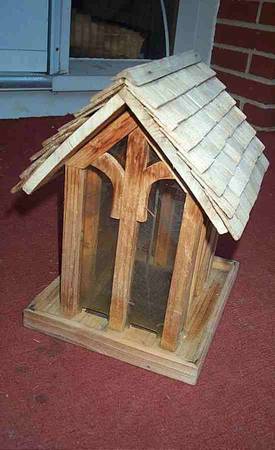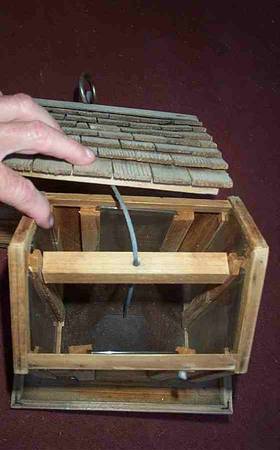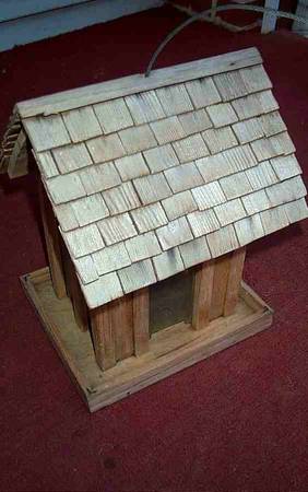 Unique hanging bird feeder wood house. Clear plastic window to view seed for ease of knowing when time to refill. Shingle rroof that removes for easy refill of seed. Secure metal hanging wire and hook for hanging. Great condition. Measures aprox 8" length x 9 1/4" deep x 12" height. Pick up from Villa Park, Illinois. Please call or text show contact info