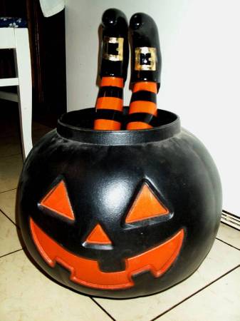 PRICE GETS TWO ITEMS. WILL NOT SEPARATE. Vintage General Foam Plastics Company hard to find Black and Orange pumpkin jack-o-lantern. Measures 13" round x 10 1/2" height. Also a pair of witch leg lawn spikes with wizzard boots. You can leave the legs in the pumpkin for a stunning display or push them in to the ground. Legs measure 3 1/2" wide x 5 1/2" deep x 18" height. Easy pick up from Villa Park, IL a few blocks north of Roosevelt Road. Please call or text show contact info