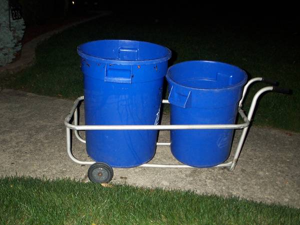 Metal cart on wheels designed for garbage can storage and transporting cans...or use this cart for moving other heavy items too. Easy grip handles. BLUE RECYCLE CANS PICTURED ARE NOT INCLUDED. THIS SALE IS FOR THE CART ONLY. The cart measyres aprox 22 1/2" length x 54" deep x 23" height. Pick up from Villa Park. Please call or text show contact info