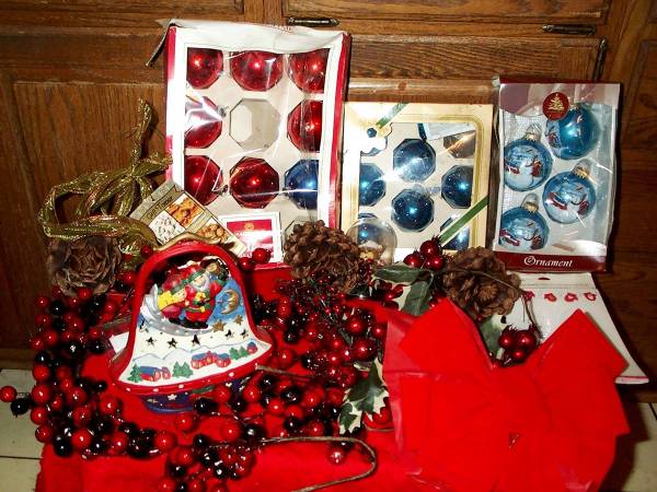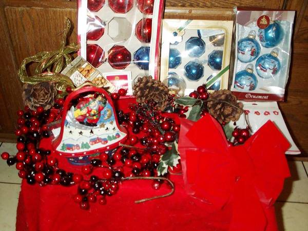 PRICE GETS THE CHRISTMAS LOT PICTURED. WILL NOT SEPARATE. Big red felt skirt to surround the bottom of your Christmas tree, 2003 Hallmark Peanuts ornament with Lucy offering psychiatric help, faux cherries, acorns, Enchanted Forest snowman glass ornaments from 2006, color glass ornaments, snow globe bear that could use some additional liquid, Hallmark writing paper still sealed, ceramic glass Santa on a sled...just insert your own light in to the base...and more...see pictures! Pick up from Villa Park. Please call or text show contact info