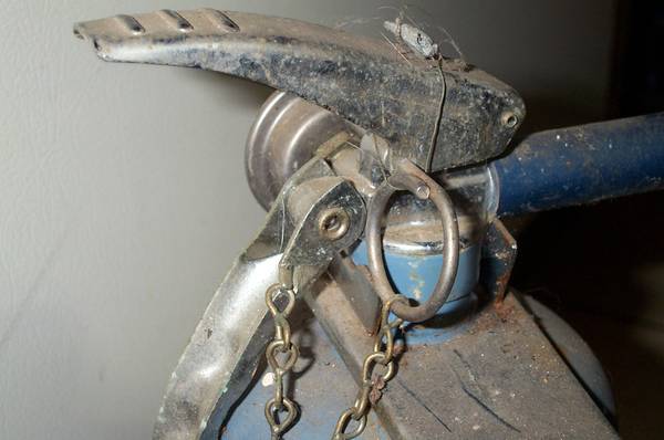 Kidde model 5 ABCS-2 dry chemical marine type fire extinguisher. Has a bracket and pressure gauge is in the middle. Dirty with some rust. Blue color. Measures aprox 6 1/2" length x 5" deep x 15" height. Pick up from Villa Park. Please call or text show contact info