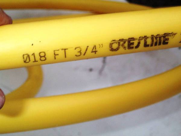 Flexible strong 3/4" Cresline yellow gas pipe. Numbers on pipe are IPS SDR 11 PE 2708 CEC ASTM D2513. Also can be utilized for water or any other liquid. One end of hose is capped. Piping looks like about 9' long. Easy pick up from Villa Park, IL. a few blocks west of Roosevelt Road. Please CALL or TEXT show contact info
