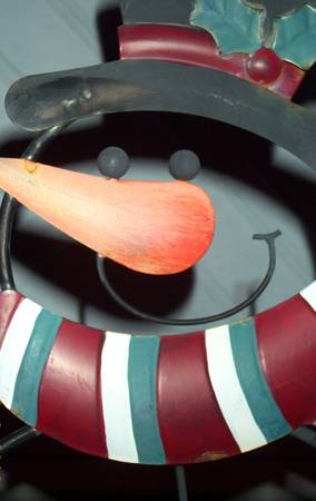 Unusual vintage wrought iron snowman decoration. Folds open to self stand. Features a center hook to hang another decoration such as a wreath. Perfect for a welcoming porch Christmas decoration. Snowman measures aprox 24" length x 13" deep x 37" height. Folds closed for easy storage and transport. Pick up from Villa Park. Please call or text show contact info
