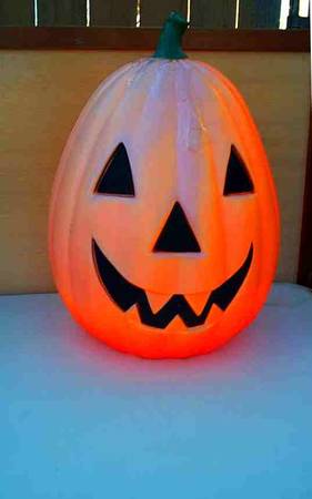 THERE IS A REPAIRED CRACK ON TOP. Big electric light up vintage orange plastic Halloween Jack-O-Lantern. There is some cracked plastic near the top secured with clear tape. From a distance you don't see the cracks. Lights up fine. Bulb included. Measures aprox 18" wide x 18" deep x 28" height. Pick up from Villa Park, Illinois. Please call or text show contact info