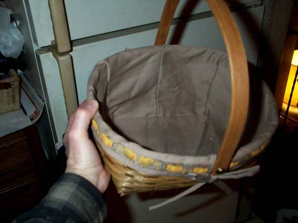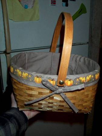 Unique vintage wicker basket with pumpkin pictures on material surrounding. Great for gifts, candy or decoration in the fall. Nice wood handle. Brown cloth lining. Measures aprox 11" wide x 10" deep x 6" height with handle down and 14" height with handle up. Pick up from Villa Park, IL. Please call or text show contact info